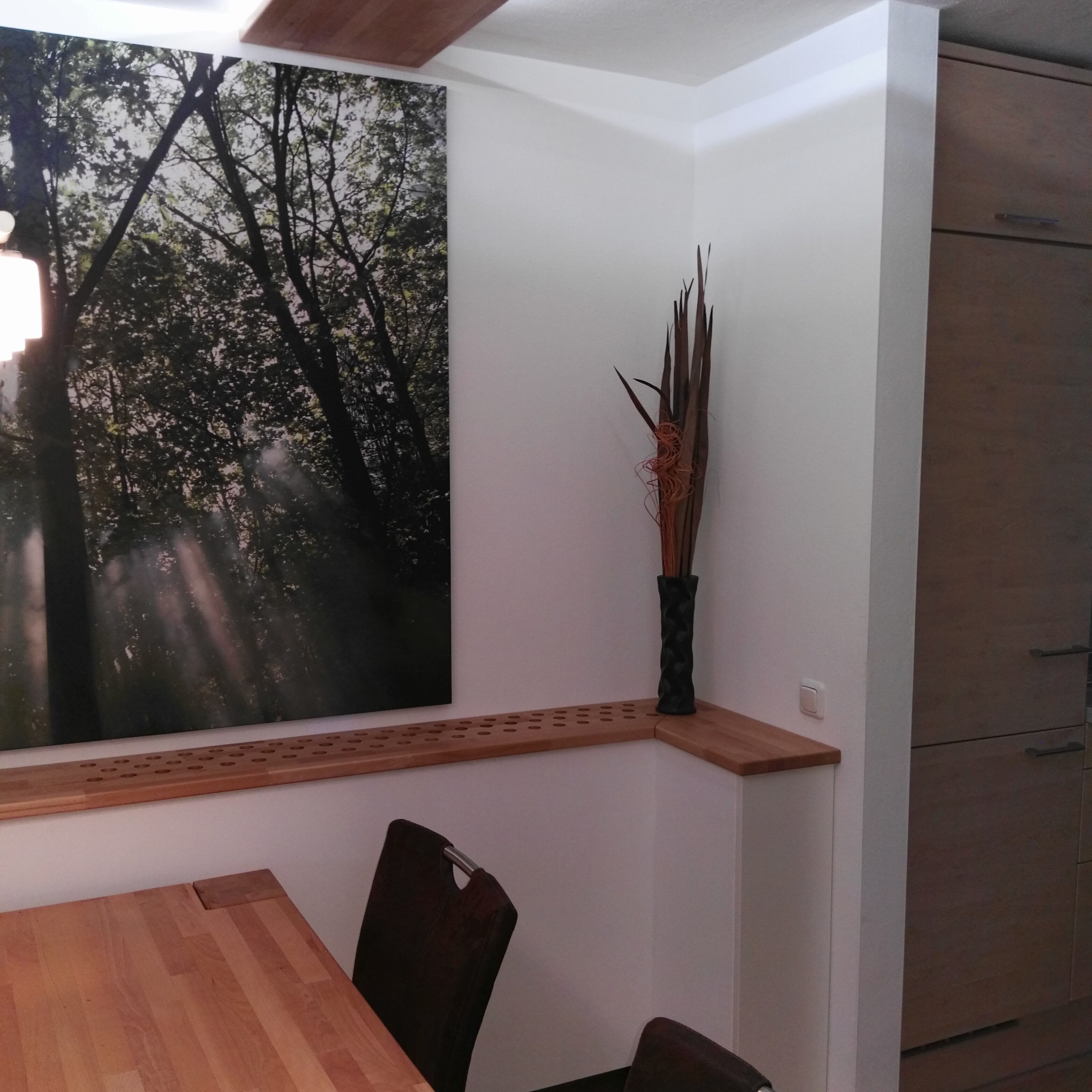 Deckenelemente in Buche Natur geölt sind nun über dem Essplatz angebracht, die indirekte Beleuchtung verleiht dem Ganzen einen schwebenden Charakter.
